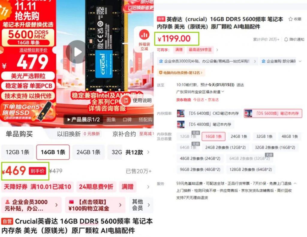 他算了一笔账,英睿达 16GB DDR5 5600 频率笔记本内存条从 469 元涨到 1199 元,涨幅 155.7%。英睿达 32GB DDR5 6000 频率 Pro 系列的内存条从 1239 元涨到 2199 元,涨幅 77.5%。其他配件也在同步涨价,1TB 的固态硬盘涨了 876 元,GPU 涨了 100 元。