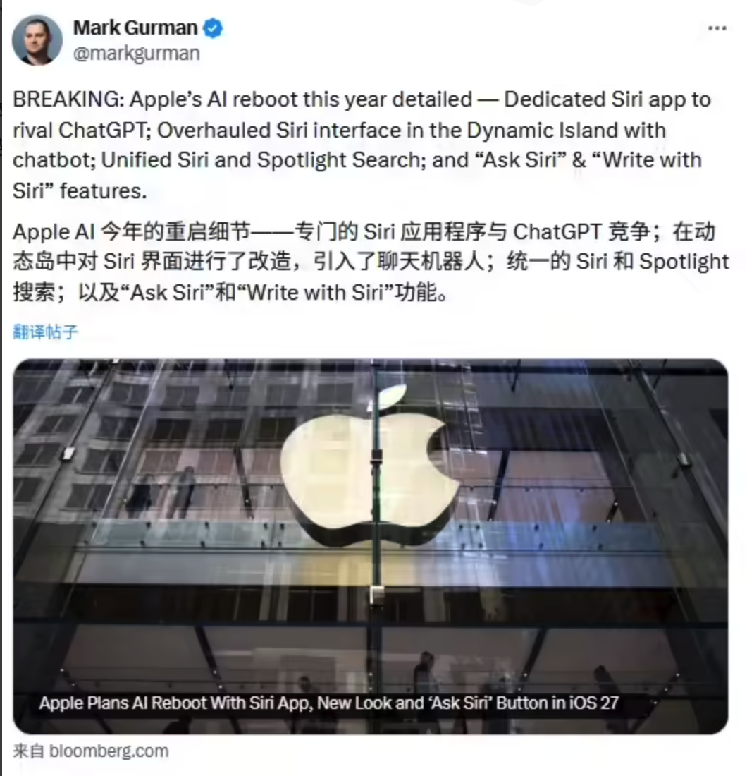 古尔曼指出,在苹果发现Apple Intelligence难以获得市场认可之后,该公司一直致力于围绕新版Siri完成AI战略重构,目标是将这一技术从传统语音助手转型为系统级的AI智能体,实现与各类功能、应用的深度集成。